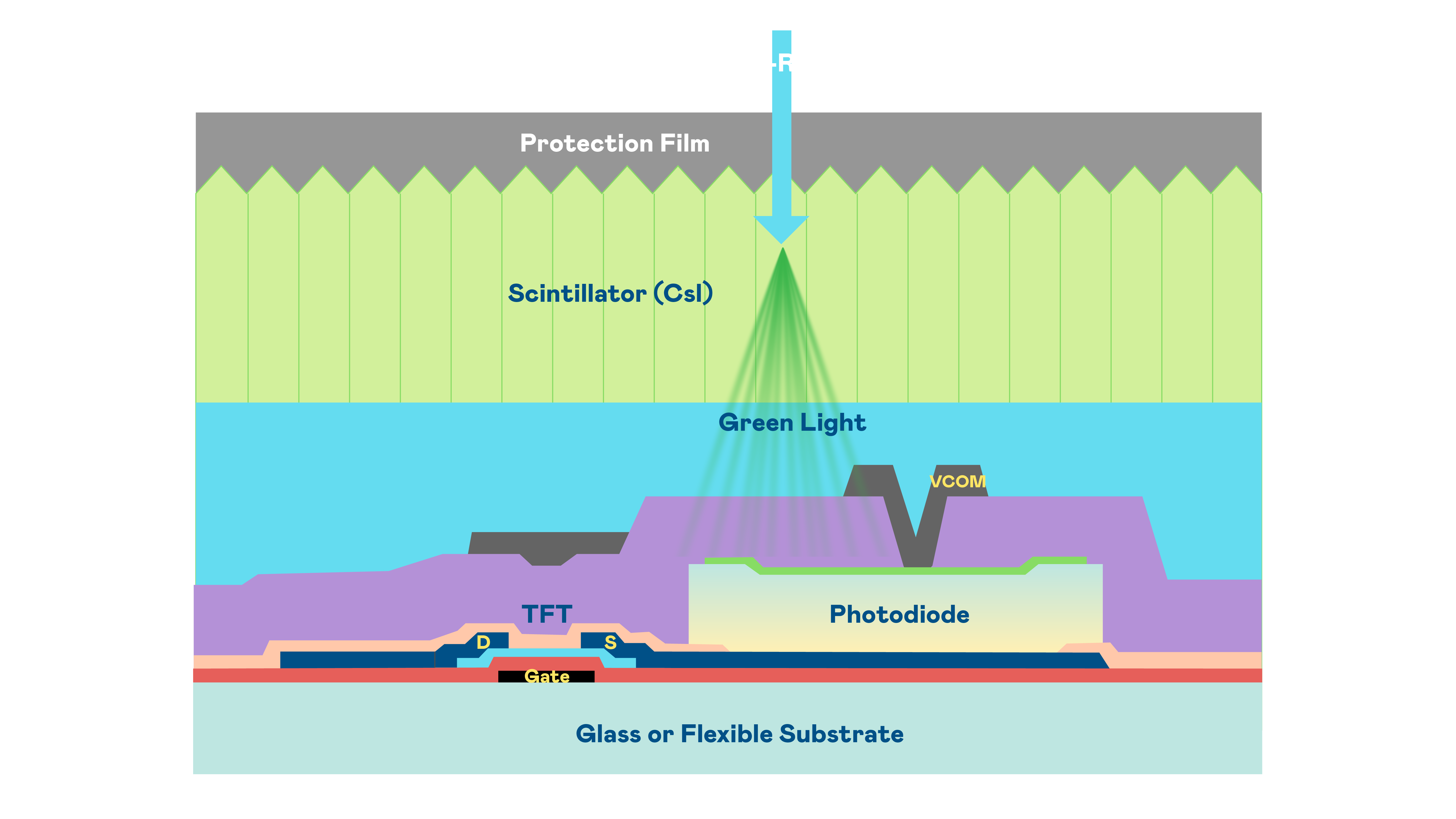 5001拉斯维加斯的X光影像感測陣列使用薄膜電晶體 (TFT) 作為每個像素的讀取開關,搭配光電二極體(Photodiode)的光電轉換元件,用以感測X光影像訊號。